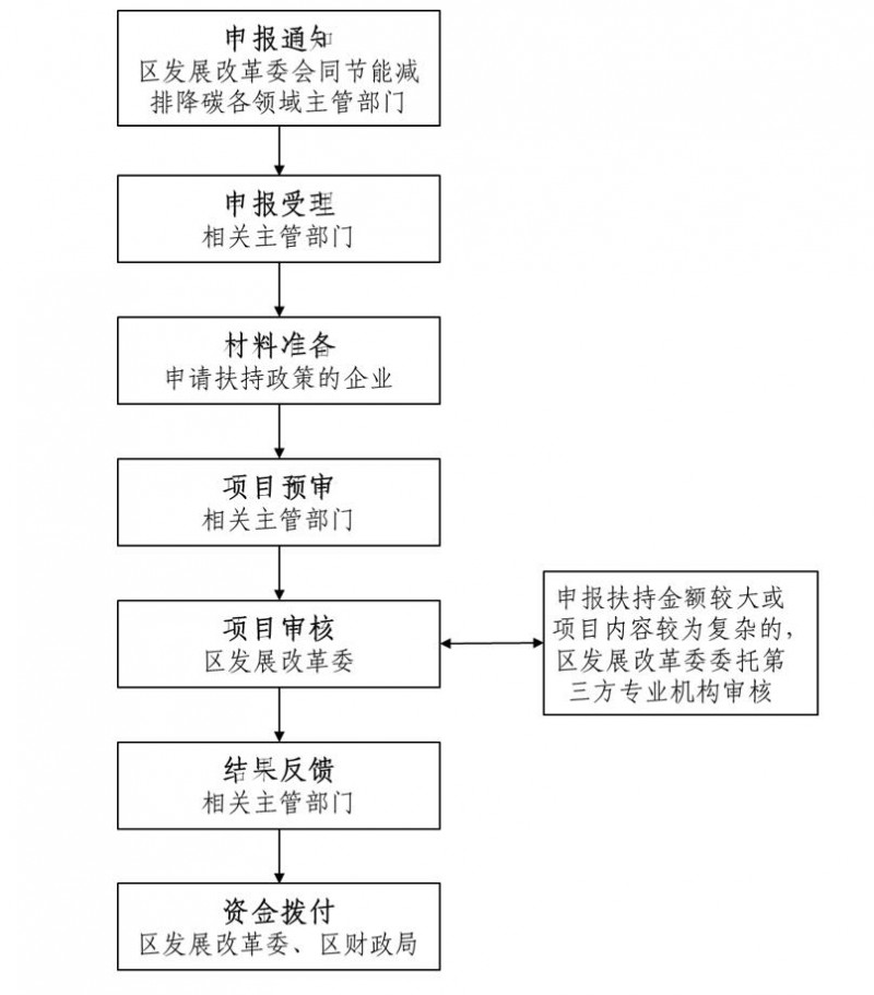 (一)申報(bào)通知。區(qū)發(fā)展改革委會(huì)同節(jié)能減排降碳各領(lǐng)域主管部門負(fù)責(zé)編制年度項(xiàng)目申報(bào)指南,申報(bào)企業(yè)按照當(dāng)年度項(xiàng)目申報(bào)指南的要求進(jìn)行申報(bào)。