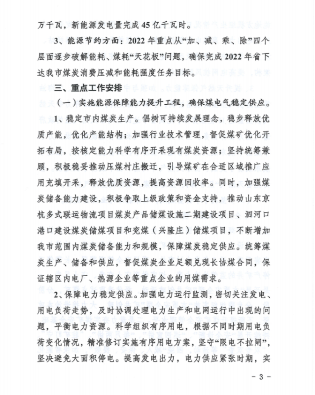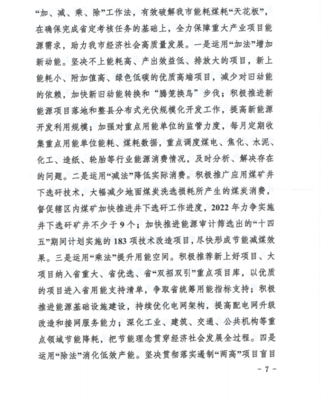 3、能源節(jié)約方面:2022年重點(diǎn)從“加、減、乘、除”四個(gè)層面逐步破解能耗、煤耗“天花板”問題,確保完成2022年省下達(dá)濟(jì)寧市煤炭消費(fèi)壓減和能耗強(qiáng)度任務(wù)目標(biāo)。
