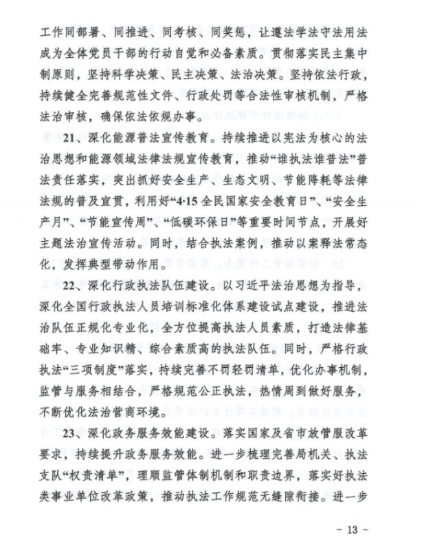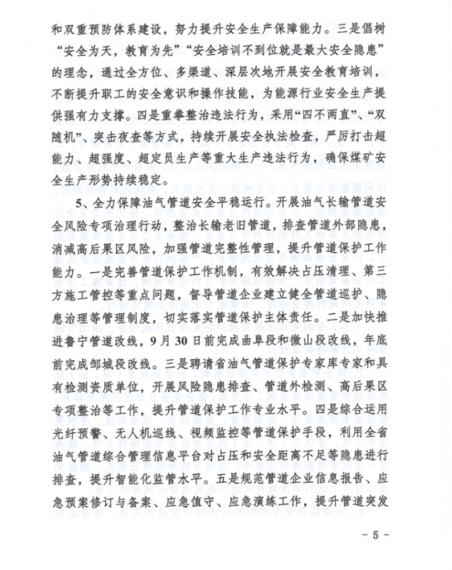1、能源安全方面:全面落實(shí)安全監(jiān)管和設(shè)施保護(hù)職責(zé),理順監(jiān)管體制機(jī)制,以安全責(zé)任落實(shí)為抓手,全力保障煤礦安全生產(chǎn)和電力、油氣管道設(shè)施安全運(yùn)行,確保能源領(lǐng)域安全生產(chǎn)形勢持續(xù)穩(wěn)定向好。