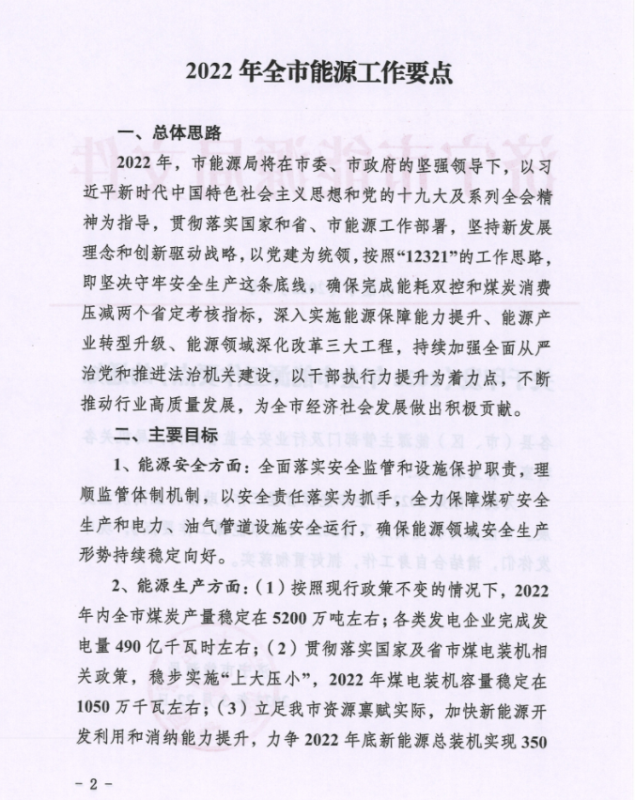 2、能源生產(chǎn)方面:(1)按照現(xiàn)行政策不變的情況下,2022年內(nèi)全市煤炭產(chǎn)量穩(wěn)定在5200萬噸左右;各類發(fā)電企業(yè)完成發(fā)電量490億千瓦時(shí)左右;(2)貫徹落實(shí)國家及省市煤電裝機(jī)相關(guān)政策,穩(wěn)步實(shí)施“上大壓小”,2022年煤電裝機(jī)容量穩(wěn)定在1050萬千瓦左右;(3)立足濟(jì)寧市資源稟賦實(shí)際,加快新能源開發(fā)利用和消納能力提升,力爭2022年底新能源總裝機(jī)實(shí)現(xiàn)350萬千瓦,新能源發(fā)電量完成45億千瓦時(shí)。