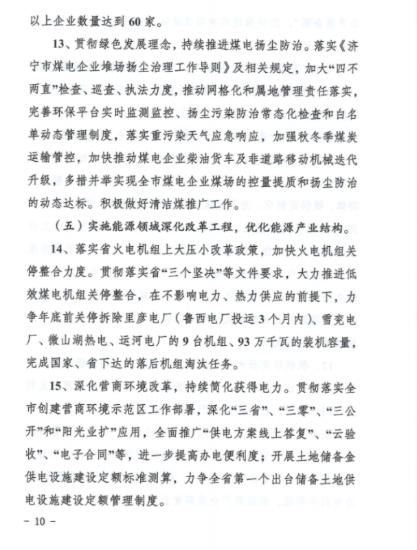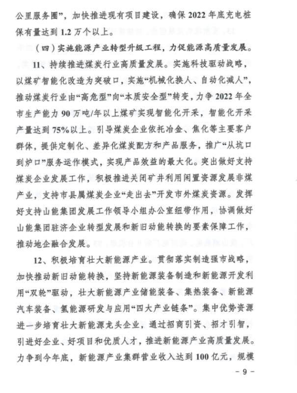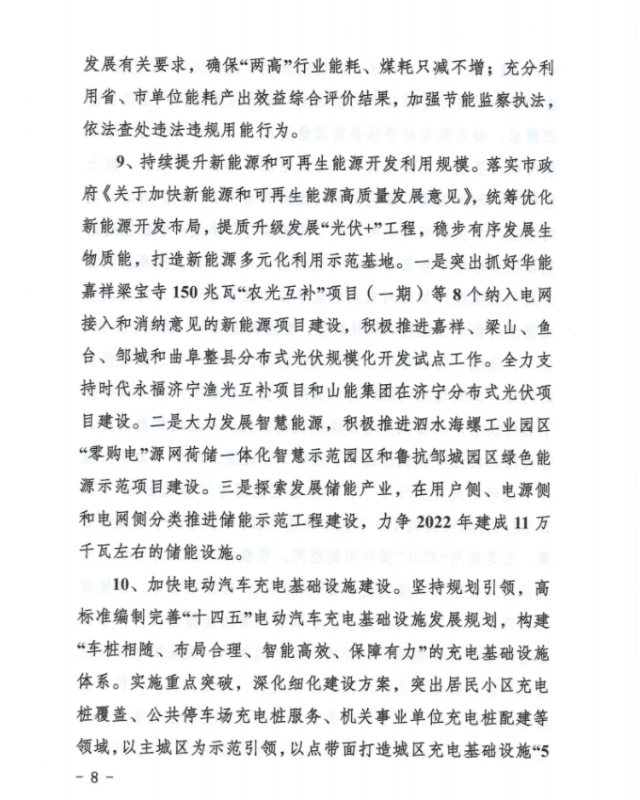 持續(xù)提升新能源和可再生能源開發(fā)利用規(guī)模。落實(shí)市政府《關(guān)于加快新能源和可再生能源高質(zhì)量發(fā)展意見》,統(tǒng)籌優(yōu)化新能源開發(fā)布局,提質(zhì)升級發(fā)展“光伏+”工程,穩(wěn)步有序發(fā)展生物質(zhì)能,打造新能源多元化利用示范基地。一是突出抓好華能嘉祥梁寶寺150兆瓦“農(nóng)光互補(bǔ)”項(xiàng)目(一期)等8個(gè)納入電網(wǎng)接入和消納意見的新能源項(xiàng)目建設(shè),積極推進(jìn)嘉祥、梁山、魚臺、鄒城和曲阜整縣分布式光伏規(guī)?;_發(fā)試點(diǎn)工作。全力支持時(shí)代永福濟(jì)寧漁光互補(bǔ)項(xiàng)目和山能集團(tuán)在濟(jì)寧分布式光伏項(xiàng)目建設(shè)。二是大力發(fā)展智慧能源,積極推進(jìn)泗水海螺工業(yè)園區(qū)“零購電”源網(wǎng)荷儲一體化智慧示范園區(qū)和魯抗鄒城園區(qū)綠色能源示范項(xiàng)目建設(shè)。三是探索發(fā)展儲能產(chǎn)業(yè),在用戶側(cè)、電源側(cè)和電網(wǎng)側(cè)分類推進(jìn)儲能示范工程建設(shè),力爭2022年建成11萬千瓦左右的儲能設(shè)施。