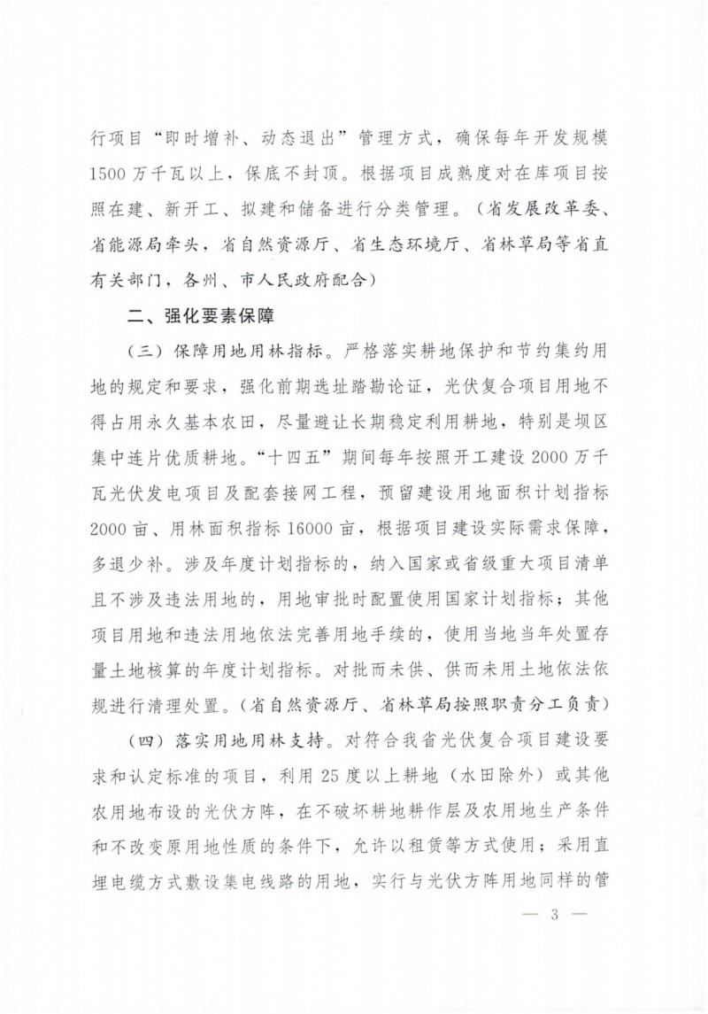 “十四五”期間按照每年開工20GW光伏項目及配套接網(wǎng)工程預留建設用地面積2000畝、用林面積1600畝,根據(jù)實際需求多退少補。對于涉及國家或省級重大項目的,用地審批配置國家計劃指標。對于符合光伏復合項目建設要求和認定標準的,利用25度以上耕地或其他農用地的,在不破壞耕地、不改變原用地性質的項目允許以租賃方式使用。