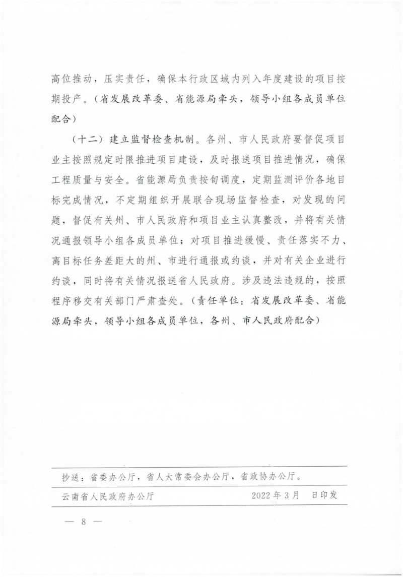 優(yōu)先支持大型基地開發(fā),重點支持金沙江下游、瀾滄江中下游、紅河流域、金沙江中游、瀾滄江金沙江上游“風光水儲”和曲靖“風光火儲”等6個多能互補基地,爭取3年內全面開工并基本建成。支持“新能源+鄉(xiāng)村振興”項目,積極開展“千鄉(xiāng)萬村沐光行動,重點支持新能源+特色產(chǎn)業(yè)、生態(tài)修復、綠色食品、鄉(xiāng)村旅游等項目。