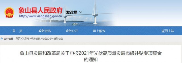 7月5日,浙江象山縣發(fā)展和改革局關于申報2021年光伏高質(zhì)量發(fā)展市級補貼專項資金的通知發(fā)布。