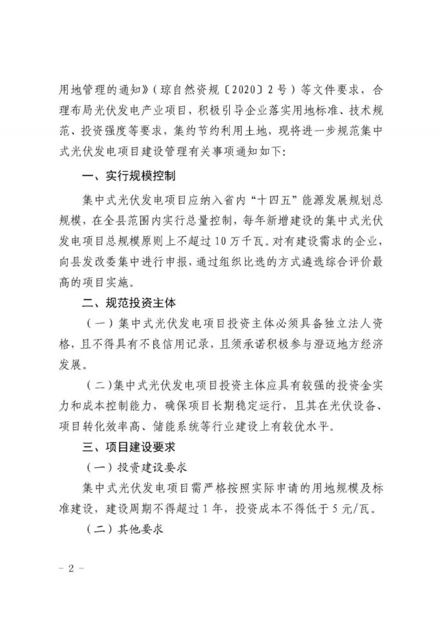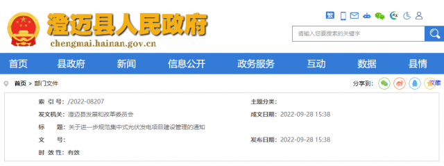 9月28日,澄邁縣政府網發(fā)布“關于進一步規(guī)范集中式光伏發(fā)電項目建設管理的通知”。