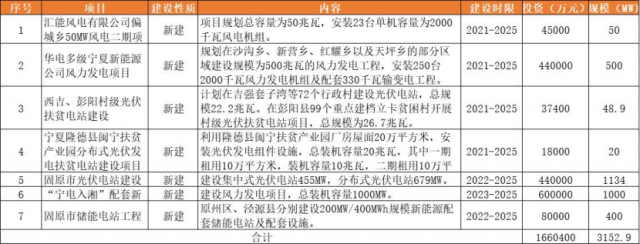 近期,固原市人民政府辦公室印發(fā)固原市自然資源保護和利用“十四五”規(guī)劃的通知。根據(jù)光伏們查詢,在固原市自然資源保護和利用“十四五”規(guī)劃建設項目庫中,有關清潔能源產業(yè)的項目共10個。其中包括光伏、風電、儲能的項目共7個,合計新能源新建規(guī)模3152.9MW,總投資金額166億元。具體項目名單如下: