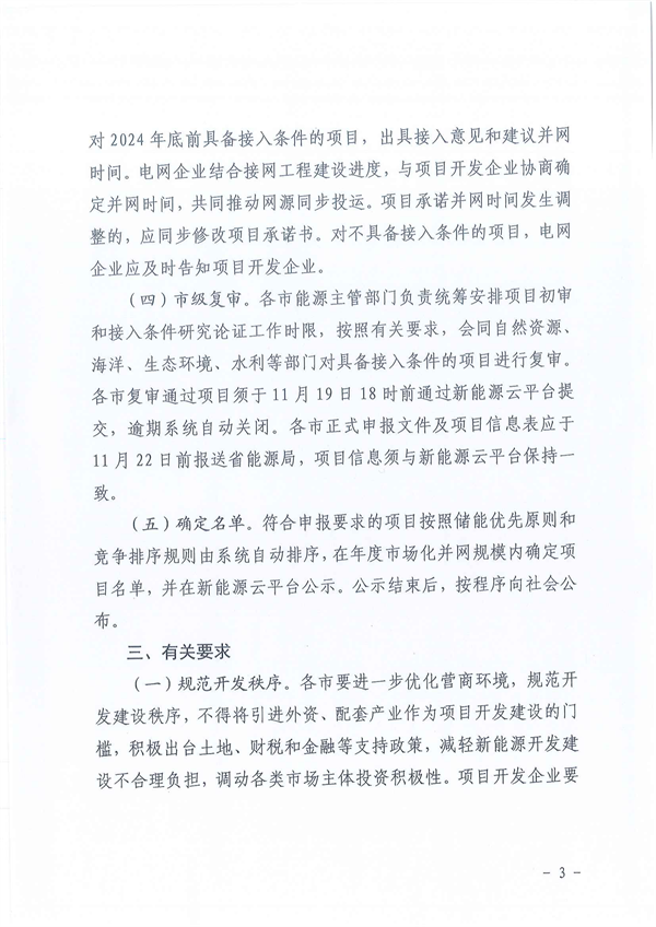 文件明確,規(guī)范開發(fā)秩序。各市要進一步優(yōu)化營商環(huán)境,規(guī)范開發(fā)建設(shè)秩序,不得將引進外資、配套產(chǎn)業(yè)作為項目開發(fā)建設(shè)的門檻,積極出臺土地、財稅和金融等支持政策,減輕新能源開發(fā)建設(shè)不合理負(fù)擔(dān),調(diào)動各類市場主體投資積極性。項目開發(fā)企業(yè)要堅持實事求是,充分考慮項目經(jīng)濟性和可行性,科學(xué)確定配置儲能容量,杜絕盲目競爭、惡意競爭。