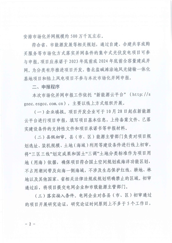 符合省、市能源發(fā)展等相關(guān)規(guī)劃,通過自建、合建共享或購買服務(wù)等市場化方式落實并網(wǎng)條件的集中式光伏發(fā)電項目可參與申報。項目應(yīng)承諾于2023年底前或2024年底前全容量建成并網(wǎng)。為分類有序推進項目開發(fā),魯北鹽堿灘涂地風(fēng)光儲輸一體化基地項目和陸上風(fēng)電項目不參與本次市場化并網(wǎng)申報。