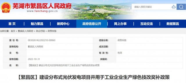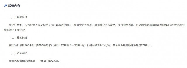 10月31日,安徽省蕪湖市繁昌區(qū)發(fā)布《建設(shè)分布式光伏發(fā)電項(xiàng)目并用于工業(yè)企業(yè)生產(chǎn)綠色技改獎補(bǔ)政策》,對“登記注冊地、稅務(wù)征管關(guān)系及統(tǒng)計(jì)關(guān)系在繁昌區(qū)范圍內(nèi),有健全財務(wù)制度、具有獨(dú)立法人資格、實(shí)行獨(dú)立核算,對區(qū)域節(jié)能減排降碳等領(lǐng)域發(fā)展作出積極貢獻(xiàn)的規(guī)上工業(yè)企業(yè)”進(jìn)行政策獎補(bǔ)。