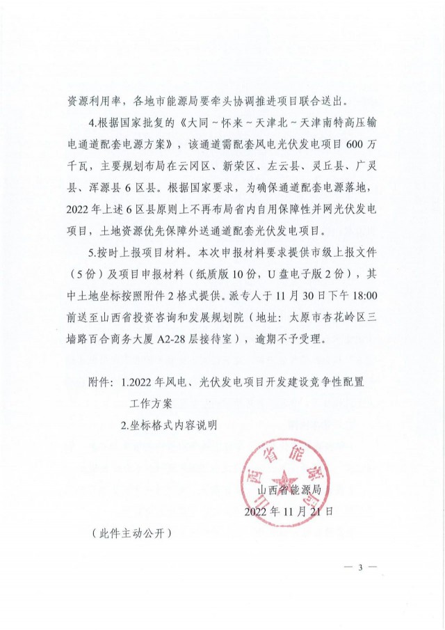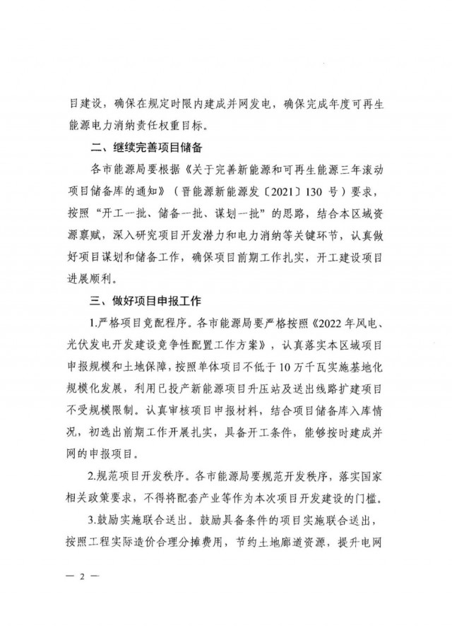《通知》要求,各市能源局要嚴格按照《2022年風電、光伏發(fā)電開發(fā)建設(shè)競爭性配置工作方案》,認真落實本區(qū)域項目申報規(guī)模和土地保障,按照單體項目不低于10萬千瓦實施基地化規(guī)?;l(fā)展,利用已投產(chǎn)新能源項目升壓站及送出線路擴建項目不受規(guī)模限制。同時,規(guī)范項目開發(fā)秩序,落實國家相關(guān)政策要求,不得將配套產(chǎn)業(yè)等作為本次項目開發(fā)建設(shè)的門檻。此外,鼓勵具備條件的項目實施聯(lián)合送出,按照工程實際造價合理分攤費用,節(jié)約土地廊道資源,提升電網(wǎng)資源利用率。