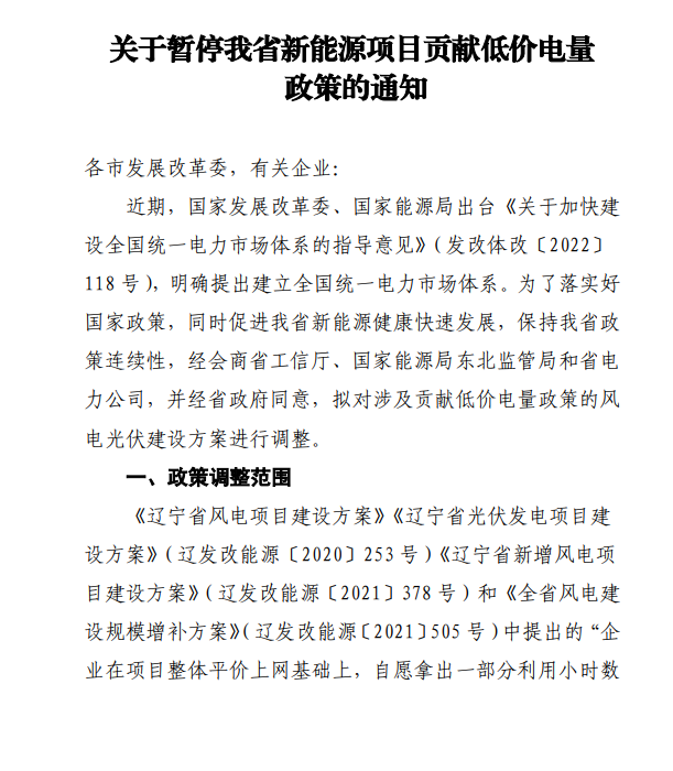 11月28日,遼寧省發(fā)改委發(fā)布通知,對(duì)《關(guān)于暫停我省新能源項(xiàng)目貢獻(xiàn)低價(jià)電量政策的通知》征求意見。