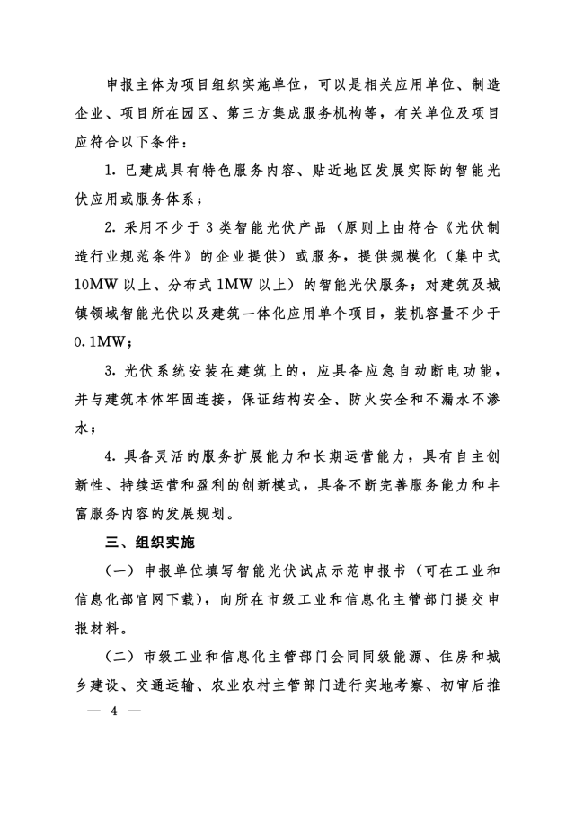 11月24日,河南省工信廳、發(fā)改委、住建廳、交通廳、農(nóng)業(yè)廳等聯(lián)合下發(fā)《關(guān)于組織申報(bào)第三批智能光伏試點(diǎn)示范的通知》,對示范企業(yè)、示范項(xiàng)目予以支持,包括: