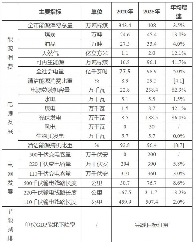 ——能源安全保障目標(biāo)。到2025年,電力裝機容量達238.4萬千瓦,清潔能源裝機容量達229.7萬千瓦,占電力總裝機容量的96.4%;新增110千伏以上輸電線路210公里以上,新增變電容量346萬千伏安;完善城市天然氣管網(wǎng)建設(shè),新建江南門站、高中壓調(diào)壓站2座,新建次高壓管網(wǎng)16公里、中壓管網(wǎng)370公里以上。