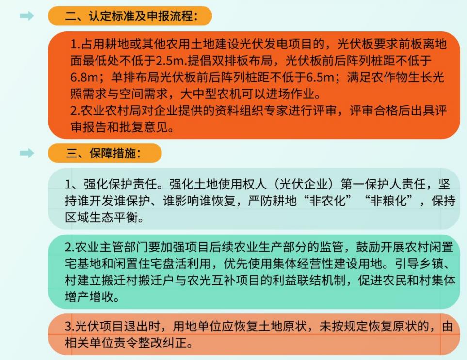 4、采用“農(nóng)光互補(bǔ)”模式使用永久基本農(nóng)田以外的耕地建設(shè)光伏復(fù)合項(xiàng)目的,需縣級(jí)農(nóng)業(yè)農(nóng)村部門出具不影響農(nóng)業(yè)生產(chǎn)的意見(jiàn)后實(shí)施。項(xiàng)目開(kāi)工前,企業(yè)需與所在縣、村委、農(nóng)戶簽訂三方補(bǔ)償協(xié)議,報(bào)縣級(jí)自然資源和農(nóng)業(yè)農(nóng)村部門備案。