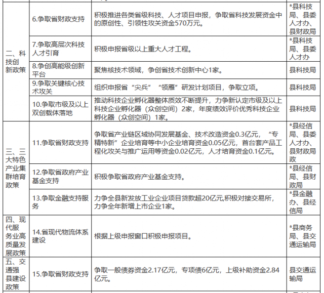 上述8個領(lǐng)域政策縣財政2023年預算安排資金,除交叉重疊部分外,支持總額約50億元。各領(lǐng)域政策縣級牽頭單位要根據(jù)文件要求,會同財政金融、自然資源、能源、人才等要素保障單位,抓緊出臺配套政策文件,及時做好政策的宣傳解讀、責任分解和落地實施,推動政策精準滴灌、直達快享,確?;鶎佑懈?、群眾獲益、企業(yè)得利。
