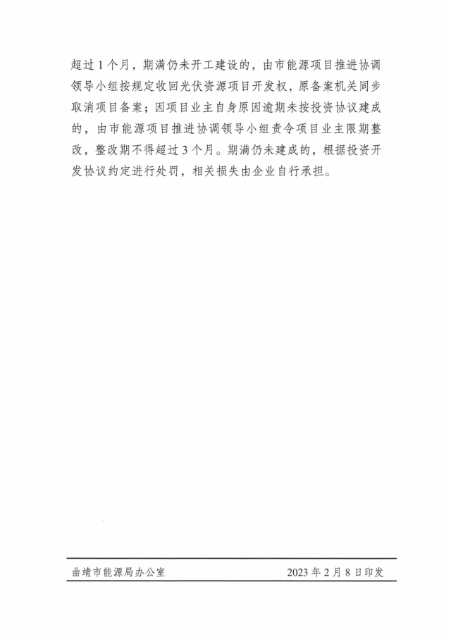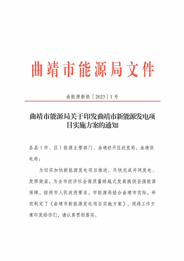 2月8日,曲靖市能源局關(guān)于印發(fā)曲靖市新能源發(fā)電項(xiàng)目實(shí)施方案的通知。通知顯示,為切實(shí)加快新能源發(fā)電項(xiàng)目推進(jìn),盡快完成并網(wǎng)發(fā)電、發(fā)揮效益,曲靖市全力推進(jìn)全市總裝機(jī)976.1萬(wàn)千瓦、總投資523.53億元的75個(gè)在建風(fēng)電、光伏項(xiàng)目建設(shè),確保2023年完成并網(wǎng)350萬(wàn)千瓦,完成投資100億元。