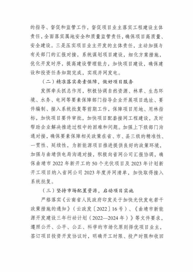 同時(shí),確保曲靖市2022年新開(kāi)工的50個(gè)光伏項(xiàng)目及2023年計(jì)劃新開(kāi)工項(xiàng)目納入省網(wǎng)公司2023年度并網(wǎng)清單,加快取得接入系統(tǒng)批復(fù)。