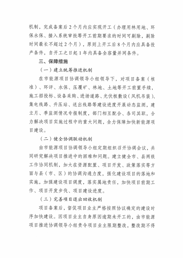 按照相關(guān)文件要求,科學(xué)的市場(chǎng)化原則擇優(yōu)項(xiàng)目業(yè)主,簽訂項(xiàng)目投資開(kāi)發(fā)協(xié)議時(shí),明確開(kāi)工時(shí)限、投產(chǎn)時(shí)限和收回機(jī)制,完成備案后2個(gè)月內(nèi)應(yīng)實(shí)現(xiàn)開(kāi)工(辦理用林用地、環(huán) 保水保、接入系統(tǒng)審批等開(kāi)工前期要求的時(shí)間可剔除,剔除 時(shí)間最長(zhǎng)不超過(guò)2個(gè)月),原則上開(kāi)工后8個(gè)月內(nèi)應(yīng)具備投產(chǎn)條件,自開(kāi)工之日起1年內(nèi)具備全容量并網(wǎng)條件。