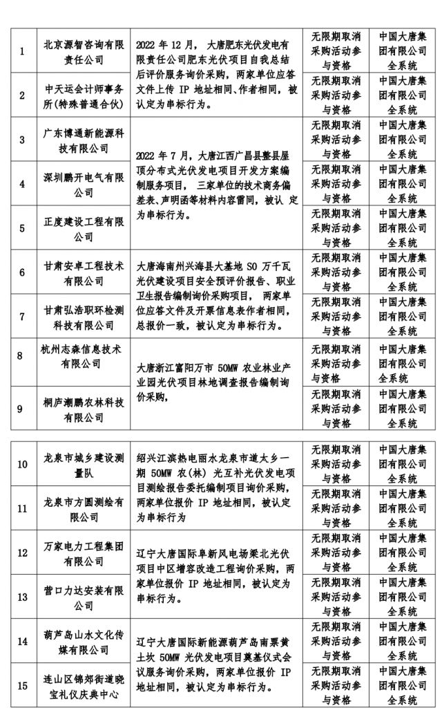 3月1日,大唐集團(tuán)發(fā)布2023年第2批關(guān)于供應(yīng)商不良行為處理情況的公告,共有699家企業(yè)被點(diǎn)名。其中,包含12個光伏項(xiàng)目招標(biāo)相關(guān)的26家供應(yīng)商被點(diǎn)名。