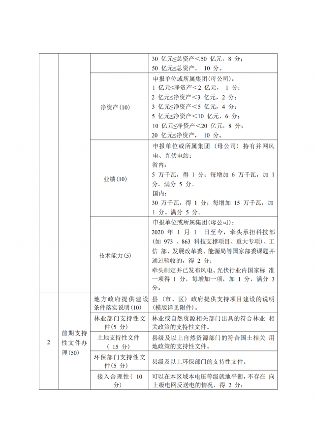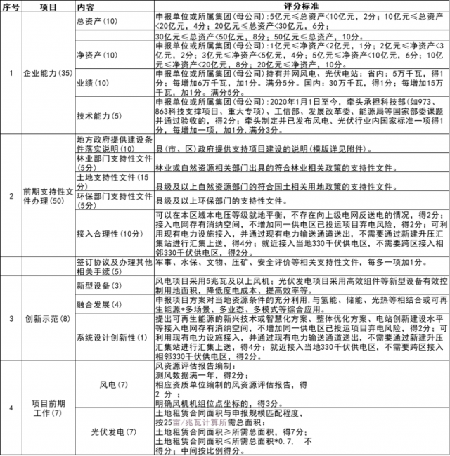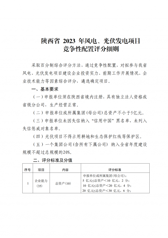 在光伏、風(fēng)電競(jìng)爭性配置評(píng)分細(xì)則上,要求申報(bào)單位須在陜西省境內(nèi)注冊(cè),具有獨(dú)立法人資格或省級(jí)分公司,生產(chǎn)經(jīng)營正常。申報(bào)單位或所屬集團(tuán)(母公司)總資產(chǎn)不小于5億元。另外,一個(gè)集團(tuán)公司(含所有下屬公司)納入全省年度建設(shè)規(guī)模不超過總規(guī)模的20%。具體評(píng)分細(xì)則如下: