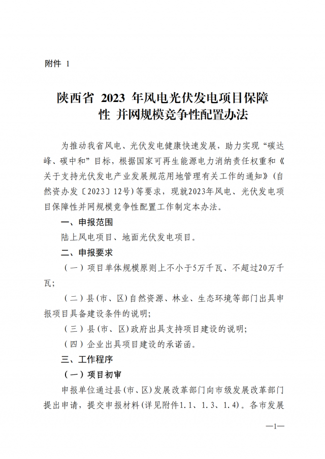 通知顯示,陜西省開展競(jìng)爭性配置,確定2023年度新增風(fēng)電、光伏發(fā)電保障性并網(wǎng)規(guī)模為1000萬千瓦。為確保項(xiàng)目質(zhì)量,保障市級(jí)權(quán)限,本次項(xiàng)目申報(bào)按照1:1.5的比例,結(jié)合區(qū)域資源條件、負(fù)荷特征和外送通道配套風(fēng)電、光伏發(fā)電項(xiàng)目的實(shí)際,對(duì)各市申報(bào)規(guī)模進(jìn)行明確,由各市共申報(bào)1500萬千瓦,省發(fā)展改革委依據(jù)競(jìng)爭性配置辦法統(tǒng)一確定1000萬千瓦納入2023年度建設(shè)方案。