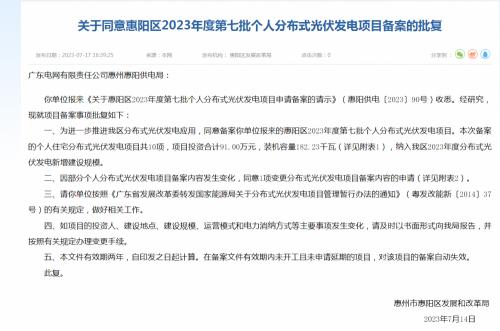 廣東惠州市惠陽區(qū)發(fā)改局: 同意182.23千瓦個人分布式項目備案
