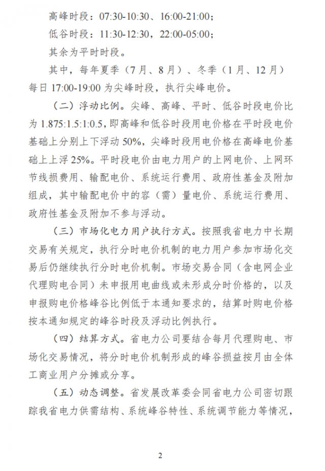 浮動比例。尖峰、高峰、平時、低谷時段電價比為1.875:1.5:1:0.5,即高峰和低谷時段用電價格在平時段電價基礎(chǔ)上分別上下浮動50%,尖峰時段用電價格在高峰電價基礎(chǔ)上上浮25%。平時段電價由電力用戶的上網(wǎng)電價、上網(wǎng)環(huán)節(jié)線損費用、輸配電價、系統(tǒng)運行費用、政府性基金及附加組成,其中輸配電價中的容(需)量電價、系統(tǒng)運行費用、政府性基金及附加不參與浮動。