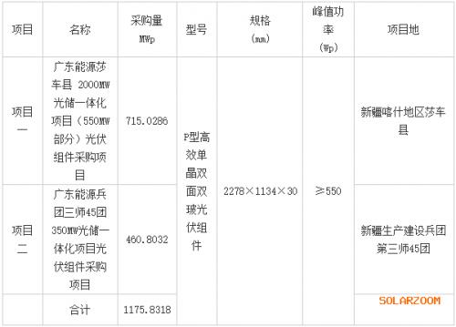 本次組件采購包括廣東能源莎車縣2000MW光儲一體化項目(550MW部分)光伏組件采購項目、廣東能源兵團三師45團350MW光儲一體化項目光伏組件采購項目的單晶雙面雙玻太陽能光伏組件及配套組串引出線用接插件、備品備件、專用工具和技術(shù)服務(wù),具體數(shù)量及要求如下: