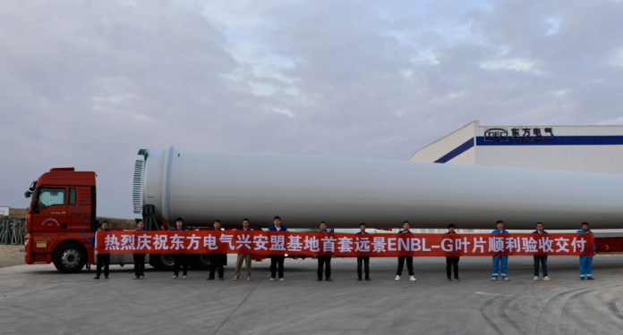 近日,大唐吉林前郭20萬千瓦風(fēng)電項目首套ENBL-G型葉片在東方風(fēng)電興安盟制造基地成功產(chǎn)出并發(fā)運,項目計劃交付22套ENBL-G型葉片。