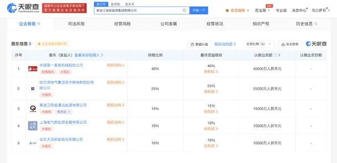 天眼查App顯示,11月20日,黑龍江省新能源集團有限公司成立,法定代表人為劉軼,注冊資本10億人民幣,經(jīng)營范圍含新興能源技術(shù)研發(fā)、風電場相關(guān)系統(tǒng)研發(fā)、以自有資金從事投資活動、風力發(fā)電技術(shù)服務(wù)、太陽能發(fā)電技術(shù)服務(wù)、儲能技術(shù)服務(wù)、工程管理服務(wù)等。股東信息顯示,該公司由中國一重(601106)、佳電股份(000922)、黑龍江辰能清潔能源有限公司、上海電氣新能源發(fā)展有限公司、北京天潤新能投資有限公司共同持股。