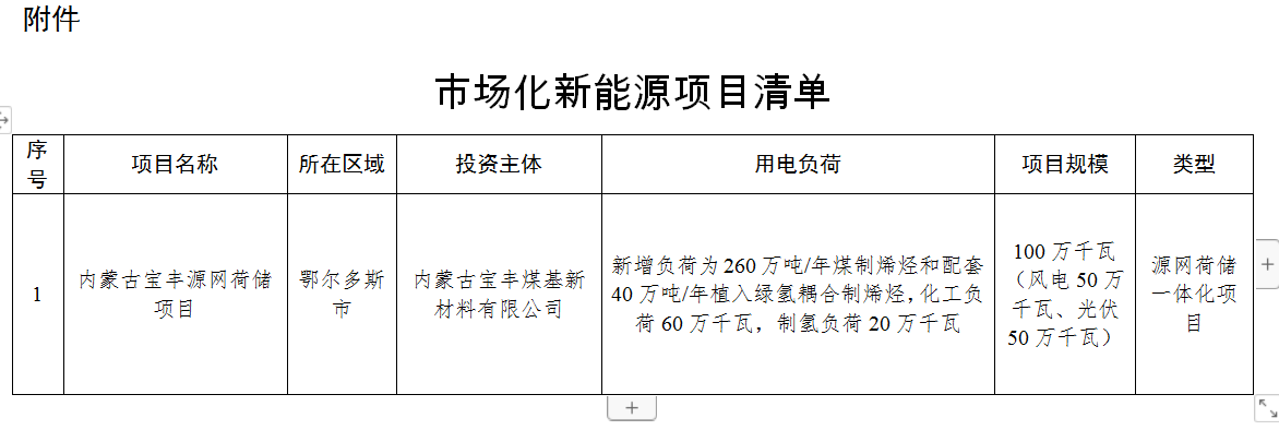 內(nèi)蒙古寶豐源網(wǎng)荷儲(chǔ)一體化項(xiàng)目,新增負(fù)荷為260萬(wàn)噸/年煤制烯烴和配套40萬(wàn)噸/年植入綠氫耦合制烯烴,化工負(fù)荷60萬(wàn)千瓦,制氫負(fù)荷20萬(wàn)千瓦,新能源建設(shè)規(guī)模為100萬(wàn)千瓦(其中,風(fēng)電50萬(wàn)千瓦、光伏50萬(wàn)千瓦),儲(chǔ)能規(guī)模為20萬(wàn)千瓦/60萬(wàn)千瓦時(shí)。
