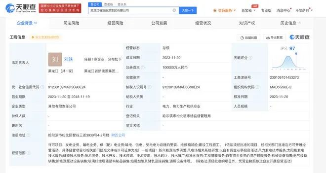 天眼查App顯示,11月20日,黑龍江省新能源集團有限公司成立,法定代表人為劉軼,注冊資本10億人民幣,經(jīng)營范圍含新興能源技術(shù)研發(fā)、風(fēng)電場相關(guān)系統(tǒng)研發(fā)、以自有資金從事投資活動、風(fēng)力發(fā)電技術(shù)服務(wù)、太陽能發(fā)電技術(shù)服務(wù)、儲能技術(shù)服務(wù)、工程管理服務(wù)等。股東信息顯示,該公司由中國一重(601106)、佳電股份(000922)、黑龍江辰能清潔能源有限公司、上海電氣新能源發(fā)展有限公司、北京天潤新能投資有限公司共同持股。