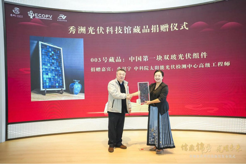 在藏品捐贈儀式環(huán)節(jié)中,來自中科院太陽能光伏檢測中心高級工程師桑識宇捐贈了一件中國第一塊雙玻光伏組件科研品;原浙江省科學(xué)技術(shù)委會副主任、原中國光電技術(shù)發(fā)展中心主任、原中國科技開發(fā)院浙江分院院長昌金銘捐贈了一塊中國七十年代高效電池樣品 ;中國綠色供應(yīng)鏈聯(lián)盟光伏專委會主任、長三角太陽能光伏技術(shù)創(chuàng)新中心主任沈輝捐贈一幅賀蘭山太陽神巖畫拓片限量復(fù)制品。秀洲光伏科技館有了這些珍貴藏品的加持,更加熠熠生輝。