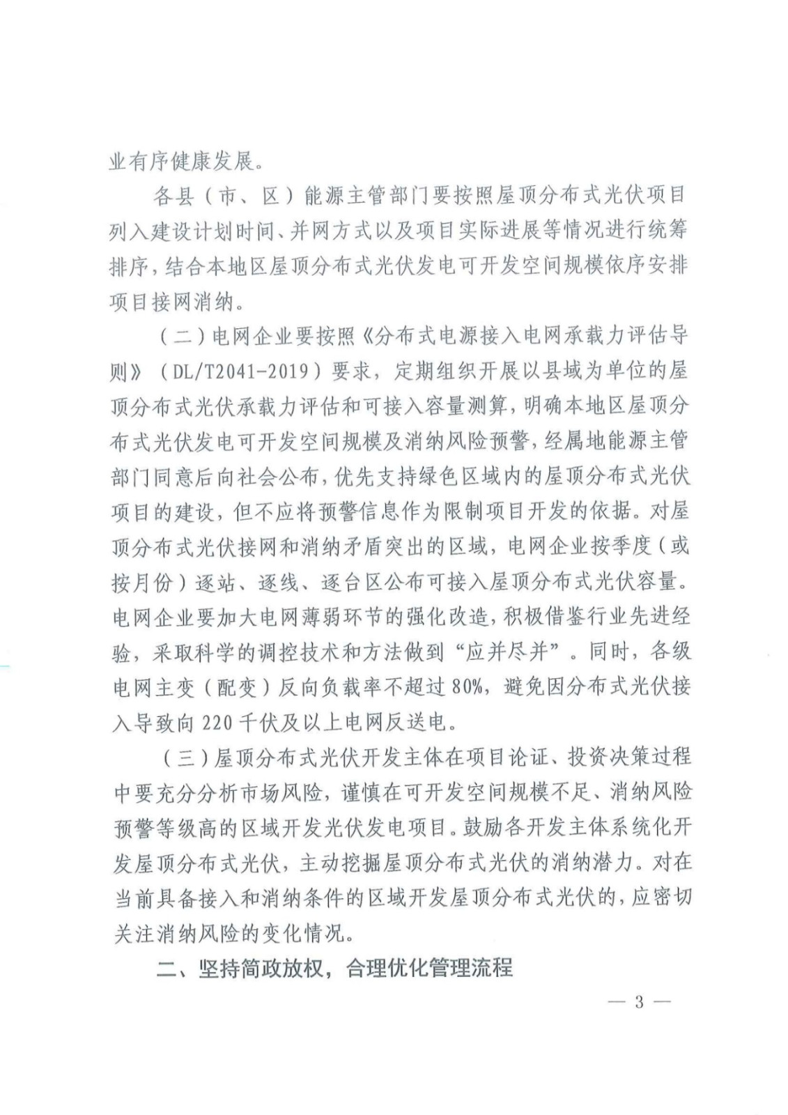 各級能源主管部門要加強新能源與火電、抽蓄、儲能和高載能項目等協(xié)同規(guī)劃,電網(wǎng)企業(yè)要定期組織開展以縣域為單位的屋頂分布式光伏承載力評估和可接入容量測算,明確可開發(fā)空間規(guī)模及消納風險預警。