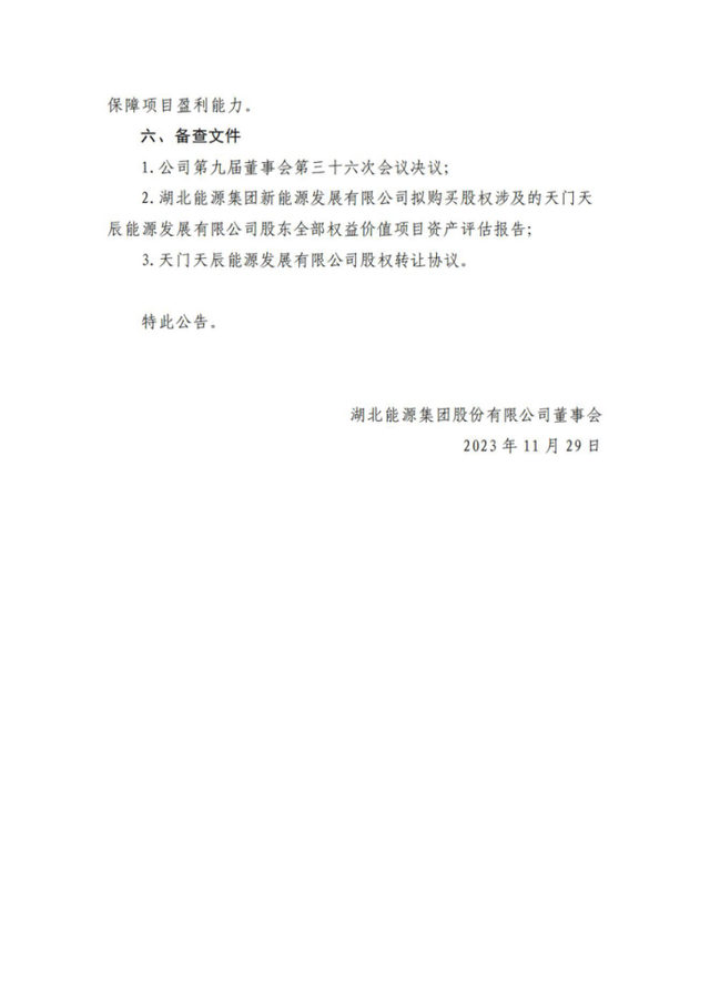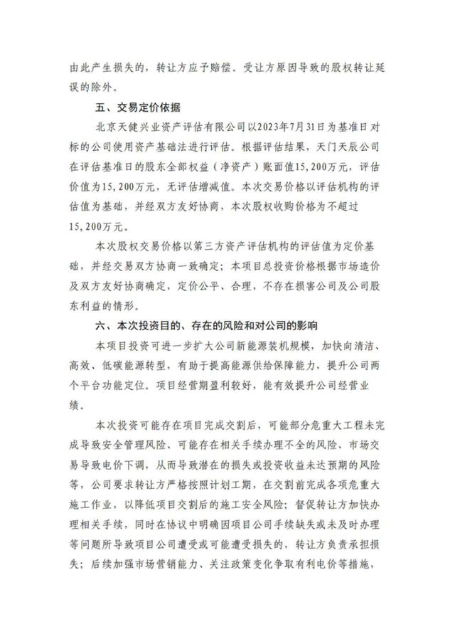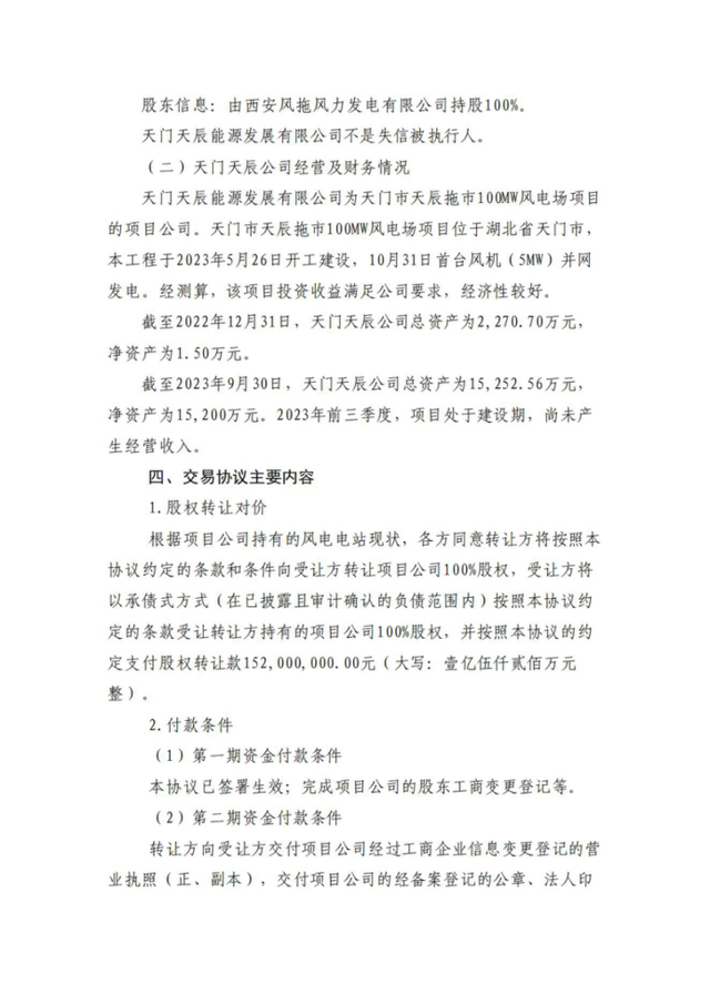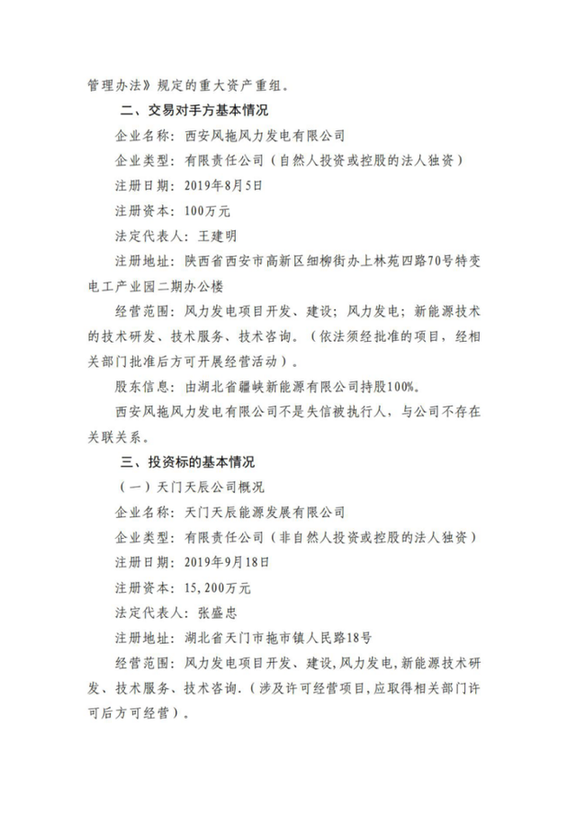 以股權(quán)對價不超過15,200萬元收購天門天辰能源發(fā)展有限公司100%股權(quán),承接其全部資產(chǎn)及經(jīng)審計確認(rèn)的負(fù)債,總投資不超過73,852萬元。天門天辰公司為天門市天辰拖市100MW風(fēng)電場項目公司。