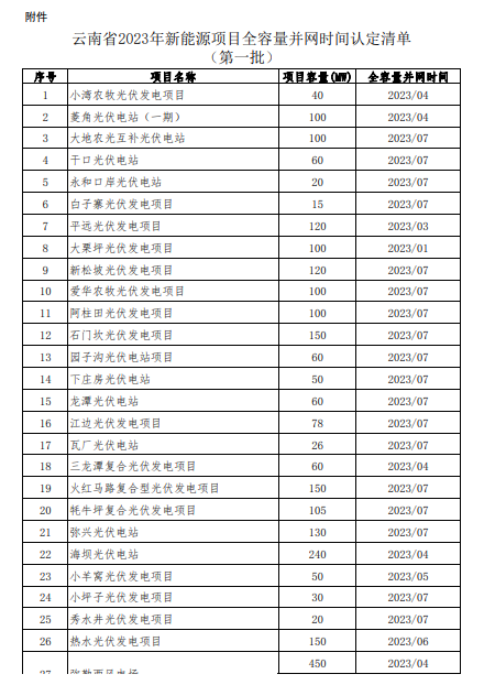 根據(jù)《云南省發(fā)展和改革委員會 云南省能源局關于云南省光伏發(fā)電上網(wǎng)電價政策有關事項的通知》(云發(fā)改價格〔2023〕319號)以及《云南省發(fā)展和改革委員會 云南省能源局關于進一步完善風電上網(wǎng)電價政策有關事項的通知》(云發(fā)改價格〔2023〕665號)文件精神,新能源全容量并網(wǎng)時間的認定由省能源局會同云南電網(wǎng)公司負責。為加強社會監(jiān)督,廣泛征求意見,現(xiàn)將經(jīng)認定后的項目清單予以公示,有關情況如下: