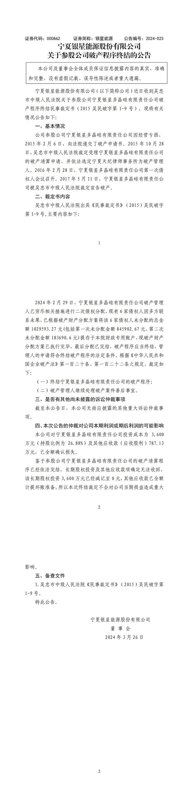 公司參股公司寧夏銀星多晶硅有限責(zé)任公司因經(jīng)營(yíng)虧損,2015年2月6日,向法院遞交了破產(chǎn)申請(qǐng)書。2015年10月28日,吳忠市中級(jí)人民法院裁定受理寧夏銀星多晶硅有限責(zé)任公司的破產(chǎn)清算申請(qǐng),并依法選定寧夏天紀(jì)律師事務(wù)所為破產(chǎn)管理人。2016年2月28日,寧夏銀星多晶硅有限責(zé)任公司第一次債權(quán)人會(huì)議召開(kāi)。2017年5月11日,寧夏銀星多晶硅有限責(zé)任公司被吳忠市中級(jí)人民法院裁定宣告破產(chǎn)。2024年2月29日,吳忠市中級(jí)人民法院裁定如下:終結(jié)寧夏銀星多晶硅有限責(zé)任公司的破產(chǎn)程序,破產(chǎn)管理人繼續(xù)處理破產(chǎn)案件善后事宜。