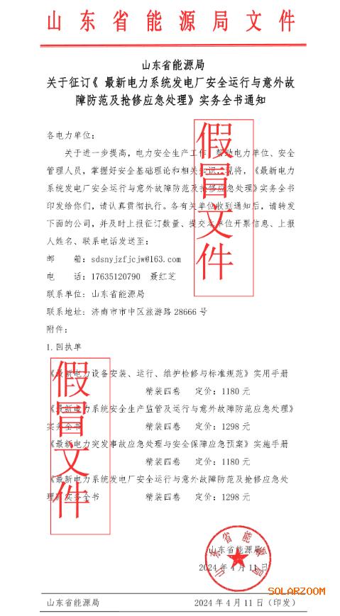 近日,我局接到舉報反映,有不法分子冒用我局名義,發(fā)布《山東省能源局關于征訂<最新電力系統(tǒng)發(fā)電廠安全運行與意外故障防范及搶修應急處理>實務全書通知》,推銷《<最新電力系統(tǒng)設備安裝、運行、維護檢修與標準規(guī)范>實用手冊》《<最新電力系統(tǒng)安全生產監(jiān)管及運行與意外故障防范應急處理>實務全書》《<最新電力突發(fā)事故應急處理與安全保障應急預案>實施手冊》《<最新電力系統(tǒng)發(fā)電廠安全運行與意外故障防范及搶修應急處理>實務全書》等書籍。
