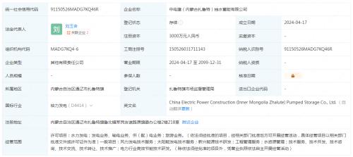 企查查顯示,4月17日,中電建(內(nèi)蒙古扎魯特)抽水蓄能有限公司成立,法定代表人為劉玉含,注冊資本3000萬人民幣,經(jīng)營范圍含風(fēng)力發(fā)電技術(shù)服務(wù)、太陽能發(fā)電技術(shù)服務(wù)、新興能源技術(shù)研發(fā)、電力行業(yè)高效節(jié)能技術(shù)研發(fā)等。