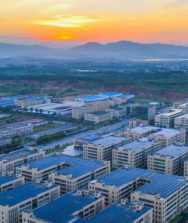 2024年7月16日,道縣高新技術產業(yè)開發(fā)區(qū)智能制造機械裝備產業(yè)園,光伏面板與夏日朝霞相映成景。