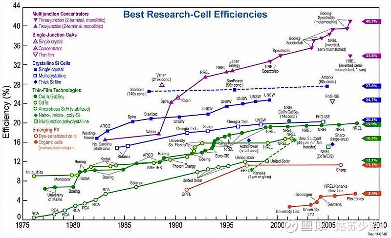 從十年前美國國家實驗室的技術(shù)演進(jìn)圖來看,光伏的效率排序:異質(zhì)結(jié)(Multijunction)>單質(zhì)結(jié)(Single-junction)>多晶電池(Crystalline Si)>薄膜電池(Thin-film)。