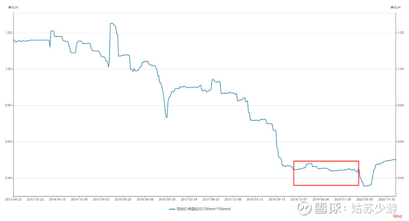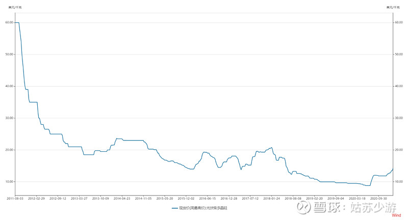 這是2011年至今的硅料價格,當(dāng)年保利協(xié)鑫的產(chǎn)能釋放完畢,硅料價格從100美元/kg跌到20美元/kg。