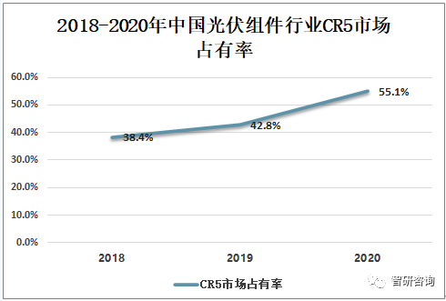 中國光伏組件行業(yè)市場(chǎng)集中度不斷提升,2020年中國光伏組件行業(yè)CR5市場(chǎng)占有率為55.1%,較2019年提高了12.3%。