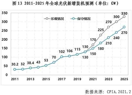(二)我國(guó)光伏市場(chǎng)將進(jìn)入快速發(fā)展新階段2021年是“十四五”規(guī)劃的開局之年,也是我國(guó)光伏發(fā)電進(jìn)入平價(jià)上網(wǎng)的關(guān)鍵之年。2021年我國(guó)光伏應(yīng)用市場(chǎng)將繼續(xù)保持快速增長(zhǎng)勢(shì)頭,預(yù)計(jì)新增裝機(jī)規(guī)??蛇_(dá)55-65GW,其中競(jìng)價(jià)結(jié)轉(zhuǎn)項(xiàng)目10GW左右,戶用市場(chǎng)有望達(dá)到15GW,工商業(yè)分布式預(yù)計(jì)在10GW左右,外送及平價(jià)地面電站在20-30GW左右。在“碳達(dá)峰、碳中和”目標(biāo)下, “十四五”期間我國(guó)光伏市場(chǎng)將迎來市場(chǎng)化建設(shè)高峰,預(yù)計(jì)國(guó)內(nèi)年均光伏裝機(jī)新增規(guī)模在70-90GW,有望進(jìn)一步加速我國(guó)能源轉(zhuǎn)型。
