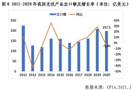 摘要:2020年,受新冠肺炎疫情的影響,全球經(jīng)濟(jì)倒退,然而我國(guó)光伏行業(yè)逆流而上,取得了令人矚目的成就,保持并延續(xù)了多項(xiàng)世界第一。應(yīng)用市場(chǎng)實(shí)現(xiàn)恢復(fù)性增長(zhǎng),2020年我國(guó)光伏新增裝機(jī)48.2GW,連續(xù)8年位居全球首位;累計(jì)裝機(jī)量達(dá)到253GW,連續(xù)6年位居全球首位;產(chǎn)業(yè)規(guī)模持續(xù)擴(kuò)大,制造端四個(gè)主要環(huán)節(jié)實(shí)現(xiàn)兩位數(shù)增長(zhǎng),多晶硅產(chǎn)量39.2萬噸,連續(xù)10年位居全球首位;光伏組件產(chǎn)量124.6GW,連續(xù)14年位居全球首位;出口市場(chǎng)穩(wěn)中有升,光伏產(chǎn)品出口額197.5億美元,同比下降5%,但組件出口量則達(dá)到78.8GW,創(chuàng)歷史新高,同比增長(zhǎng)18.3%。