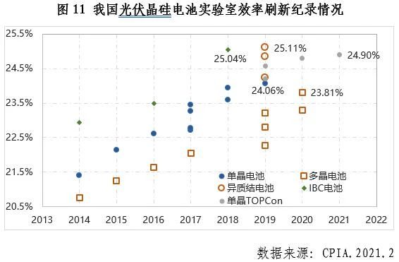 實(shí)驗(yàn)室方面,2020年4月,晶科研發(fā)的多晶硅(Multicrystalline)電池片實(shí)驗(yàn)室效率達(dá)到23.3%,并被收錄于NREL電池片轉(zhuǎn)換效率紀(jì)錄表中,隨后阿特斯宣布將該效率提高至23.81%。7月,晶科宣布其研發(fā)的N型單晶硅單結(jié)電池片效率達(dá)到24.79%,2021年1月,將該紀(jì)錄再次刷新到24.90%,創(chuàng)造了新的大面積N型單晶鈍化接觸電池片效率世界紀(jì)錄。我國(guó)除了在晶硅電池技術(shù)方面領(lǐng)先全球外,鈣鈦礦、有機(jī)電池等電池片實(shí)驗(yàn)室效率也走在世界前列,2020年7月,杭州纖納光電以18.04%的鈣鈦礦小組件光電轉(zhuǎn)換效率的成績(jī),第七次蟬聯(lián)了鈣鈦礦小組件世界紀(jì)錄榜首。目前NREL電池片轉(zhuǎn)換效率紀(jì)錄表中,除晶科的多晶硅電池片外,上海交大/北航、中科院化學(xué)所和漢能分別研發(fā)的有機(jī)電池、有機(jī)疊層電池和薄膜電池仍保持著世界紀(jì)錄。