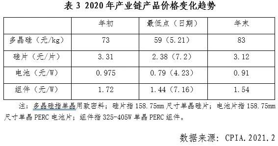 (四)產(chǎn)業(yè)鏈供給矛盾突出2020年,光伏產(chǎn)品價(jià)格經(jīng)歷了V字型起伏的過程,光伏產(chǎn)業(yè)硅料、玻璃和EVA膠膜等部分原輔材料環(huán)節(jié)出現(xiàn)的供需緊張也前所未有。上半年,受全球疫情蔓延影響,對(duì)下游應(yīng)用市場(chǎng)未來需求的不確定性導(dǎo)致產(chǎn)業(yè)鏈大幅降價(jià),各環(huán)節(jié)價(jià)格降幅均在20%左右。硅料環(huán)節(jié),三季度受到事故及自然災(zāi)害等因素影響供應(yīng)緊張,8月多晶硅致密料價(jià)格由6月的59元/公斤增加至約95元/公斤,漲幅約為60%;四季度隨著新疆地區(qū)硅料企業(yè)復(fù)工,多晶硅價(jià)格回落,但仍高于二季度價(jià)格低點(diǎn)38%。EVA膠膜的生產(chǎn)設(shè)備及原材料EVA粒子可用于防疫物資生產(chǎn),2020年防疫物資需求暴漲,使得生產(chǎn)設(shè)備及EVA粒子供應(yīng)緊張,膠膜企業(yè)擴(kuò)產(chǎn)受阻延遲,在下半年需求暴漲的情況下,EVA膠膜企業(yè)只能通過大幅漲價(jià)的方式來獲取EVA粒子資源。下半年EVA膠膜價(jià)格上漲了50%,一度達(dá)到14元/平方米的高價(jià),和POE膠膜的價(jià)格形成了倒掛。下半年需求的集中爆發(fā)導(dǎo)致光伏玻璃供給出現(xiàn)巨大缺口,價(jià)格快速上漲,年底3.2mm光伏玻璃價(jià)格達(dá)到了43元/平方米,較5-6月最低時(shí)上漲80%,部分企業(yè)采用浮法玻璃作為雙面組件的背板玻璃。進(jìn)入12月,產(chǎn)品價(jià)格趨于平緩。但全年來看,除多晶硅價(jià)格上漲13.7%以外,硅片、電池、組件產(chǎn)品價(jià)格仍分別下降了5.7%、6.7%與10.5%,降本增效發(fā)展方向沒有變,長(zhǎng)期來看價(jià)格依然是下降趨勢(shì)。