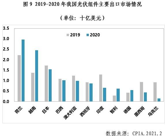 從光伏組件出口市場(chǎng)來看,2020年光伏組件主要出口市場(chǎng)中傳統(tǒng)市場(chǎng)活力不減,其中荷蘭和越南市場(chǎng)份額增長(zhǎng)明顯。在光伏發(fā)電成本持續(xù)降低以及歐盟綠色協(xié)議的背景下,歐洲市場(chǎng)保持增長(zhǎng)勢(shì)頭,荷蘭作為歐洲市場(chǎng)的集散中心出口量持續(xù)增長(zhǎng)。越南新一輪FIT政策引發(fā)了越南屋頂光伏的搶裝熱潮,根據(jù)越南工貿(mào)部的公告顯示,2020年越南光伏新增裝機(jī)為10.75GW,成為全球前3大光伏市場(chǎng),其中屋頂光伏裝機(jī)超過9GW。越南市場(chǎng)新增裝機(jī)猛增,對(duì)我國(guó)組件需求明顯增長(zhǎng),成為第二大光伏組件出口市場(chǎng)。印度市場(chǎng)受疫情影響,市場(chǎng)需求下降較為明顯。曾經(jīng)的新興市場(chǎng)烏克蘭因其國(guó)內(nèi)電價(jià)的下降致使光伏項(xiàng)目的收益有所降低,投資熱情減退,市場(chǎng)需求下降。墨西哥市場(chǎng)受到清潔能源拍賣的取消以及后續(xù)政策不確定性的影響未能延續(xù)之前的增長(zhǎng)勢(shì)頭,市場(chǎng)需求有所下降。
