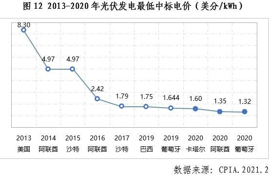 (五)光伏發(fā)電電價(jià)與成本持續(xù)下降2020年,全球光伏發(fā)電中標(biāo)電價(jià)繼續(xù)下降,僅一年中全球就有三個(gè)項(xiàng)目接連創(chuàng)造了最低中標(biāo)電價(jià)。8月,位于葡萄牙一光伏項(xiàng)目中標(biāo)電價(jià)達(dá)到了0.0112歐元/kWh(約1.32美分/kWh),折合當(dāng)時(shí)人民幣價(jià)格約0.091元/kWh。這一電價(jià)比2019年最低中標(biāo)電價(jià)降低了0.324美分/kWh,降幅達(dá)到19.7%。2020年,我國(guó)光伏發(fā)電項(xiàng)目中標(biāo)電價(jià)也刷新最低紀(jì)錄,青海海南州一光伏發(fā)電競(jìng)價(jià)項(xiàng)目中標(biāo)電價(jià)為0.2427元/kWh(約3.46美分/kWh),低于2019年達(dá)拉特旗光伏項(xiàng)目0.26元/kWh的電價(jià)。除此之外,卡塔爾、阿聯(lián)酋、印度等國(guó)光伏中標(biāo)電價(jià)也打破了原來的最低紀(jì)錄。光伏發(fā)電價(jià)格已經(jīng)在全球越來越多的國(guó)家及地區(qū)低于火電,成為了最具競(jìng)爭(zhēng)力的電力產(chǎn)品。