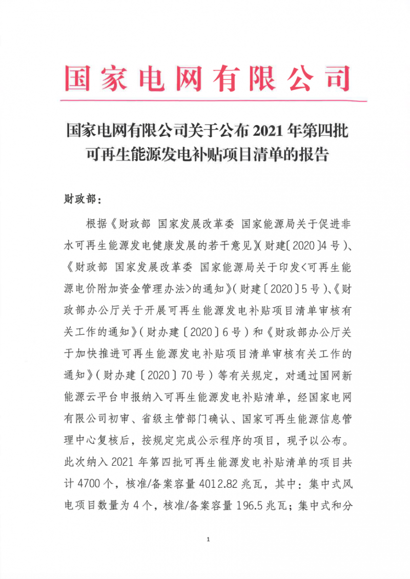 關(guān)于公布2021年第四批可再生能源發(fā)電補(bǔ)貼項(xiàng)目清單的公告